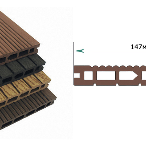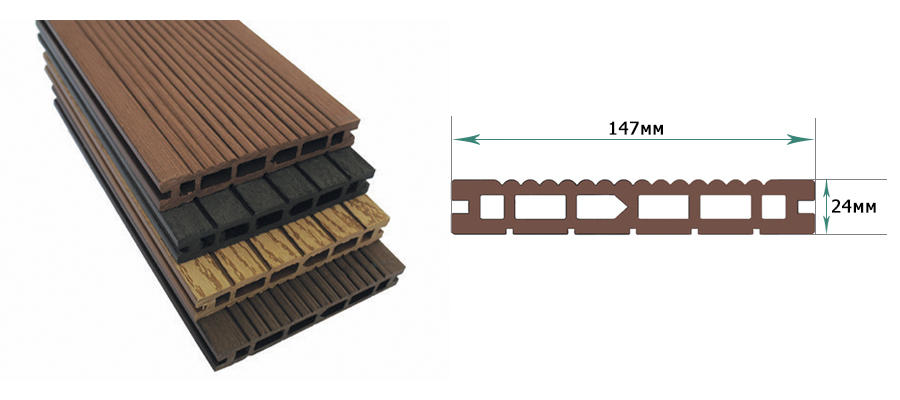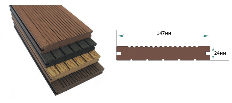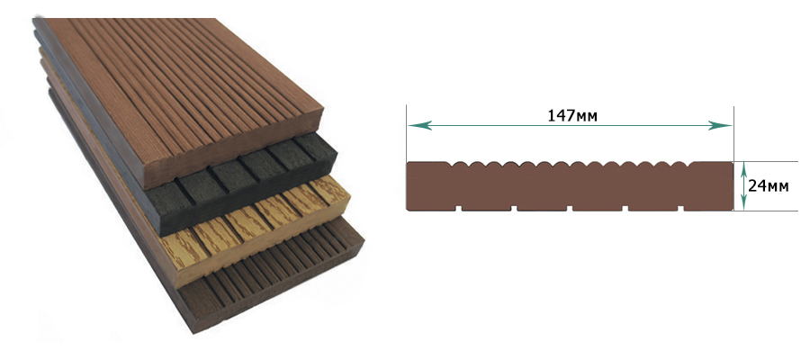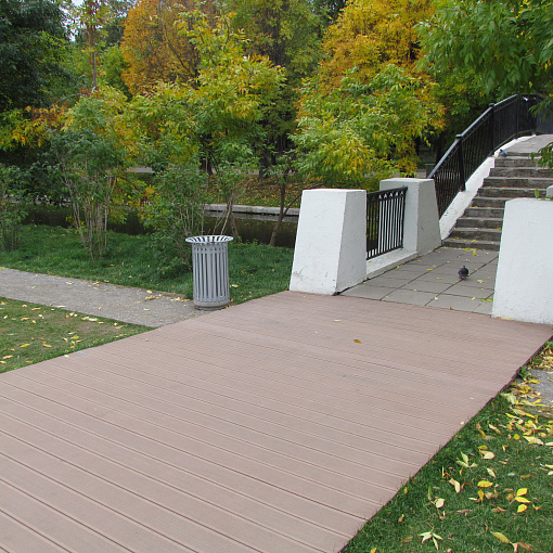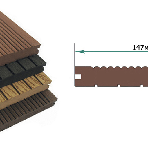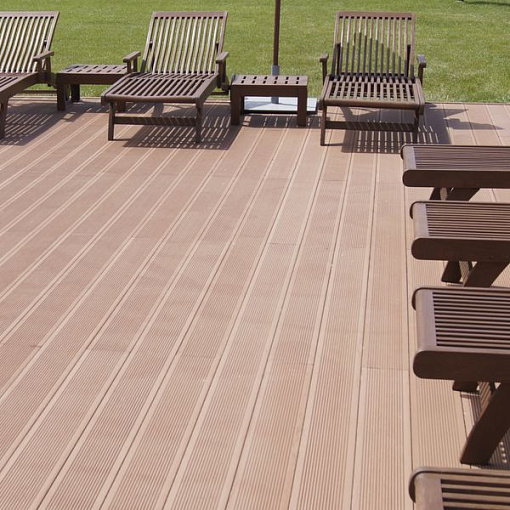 Террасная доска Terrapol Классик выполненая в виде палубной доски и имеет более высокую износостойкость, чем террасная доска с рисунком под дерево.